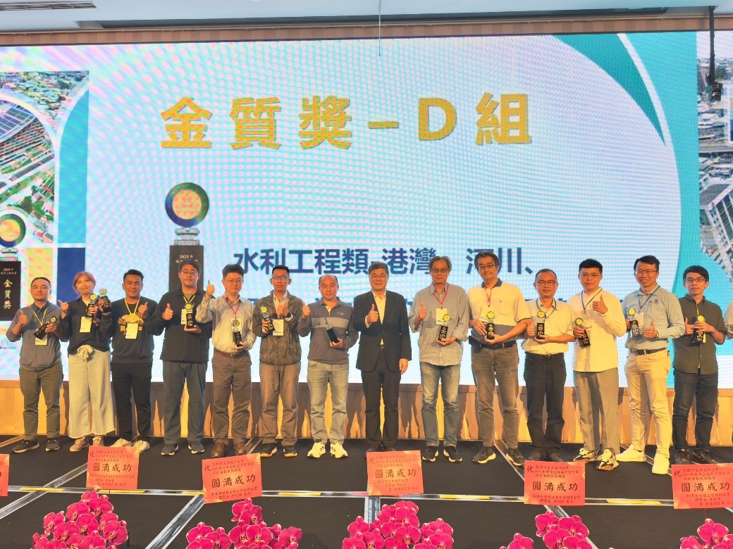 農田水利署高雄管理處參加高雄市土木技師公會、社團法人高雄市建築師公會及高雄市結構工程工業技師公會聯合舉辦的「2025城市工程品質金質獎」第十一屆評鑑,今年再度以「寶隆圳進水口固床工強化工程」及「三爺埤溢洪道護岸(0K+000)改善工程」榮獲城市工程品質水利工程類金質奬,於114年12月2日假高雄漢來飯店巨蛋會館舉行頒獎典禮,由高雄管理處主任工程師蘇俊霖與工務組長盧建成代表出席領奬。